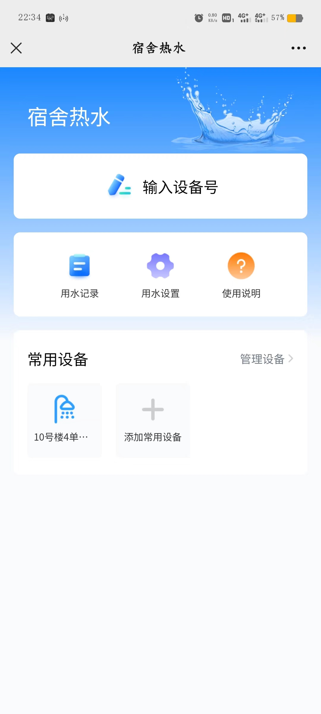 2.房间设备号绑定完成后,即可点击已绑定的常用设备,点击“开始使用”,打开水龙头即可使用热水,在宿舍内任何距离均不影响热水使用,建议手机放置远离宿舍热水区域。