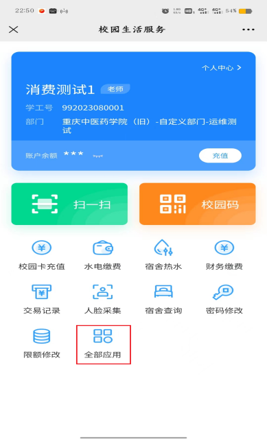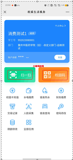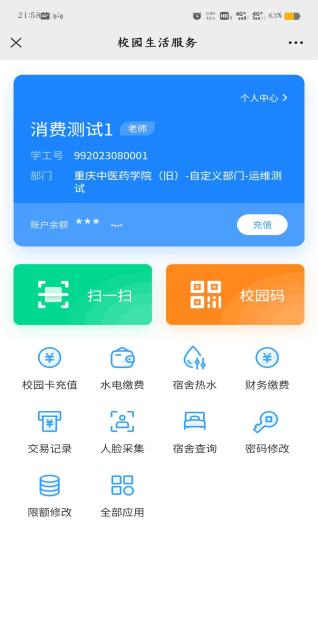点击“校园卡充值”,输入具体金额,按照提示完成充值操作。