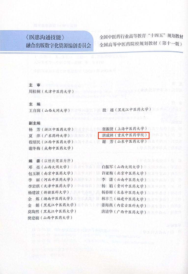 米兰官网唐成林教授作为副主编参与编著的全国中医药行业高等教育 “十四五”规划教材《医患沟通技能》正式出版
