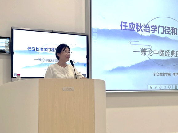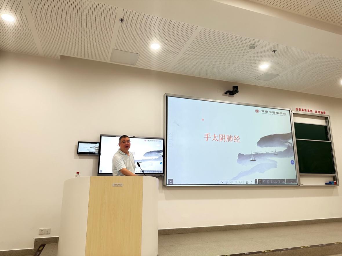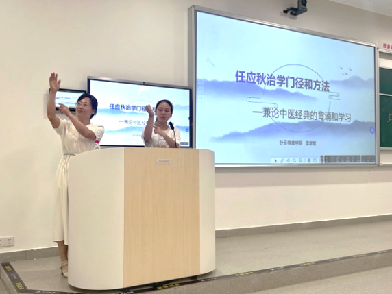讲座期间,唐院长见一女生面色苍白、神情有异,原来是该同学因贪食冷饮而恶心欲吐、腹痛,针灸推拿学院党总支副书记、副院长李学智教授当即以指代针,为同学按压内关穴,并告知穴位的定位和功效,数分钟后症状豁然消失。随后该同学为大家演示内关穴的取穴方法,引得同学们赞叹经络腧穴之神奇,极大地激发了大家的专业热情。李学智教授引经据典,告诫同学们要珍惜大学时光,珍惜伟大的传统中医文化,要立志“成大医、做明医”;并以重庆本土中医大师任应秋老先生的故事,结合自己从医多年的读书体会,告诉同学们治学应精读经典、勤写、深思、善记,并引《灵枢》经文,劝勉同学们树立专业信心,精研学问,方能成大医明医。