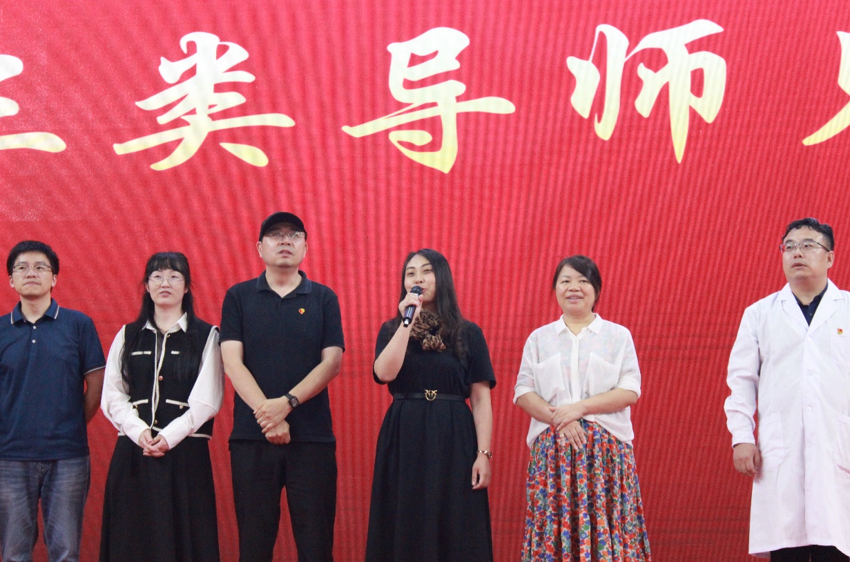 三类导师樊文彬、张明明等教师代表上台与学生见面。朱峰老师领读医学生誓词,全体师生全体起立,举起右手进行了宣誓,整个现场庄严肃穆,每个人眼神都透露出一种坚定和自信,在那一刻,体育馆上空似乎都充满了一种神圣的力量。