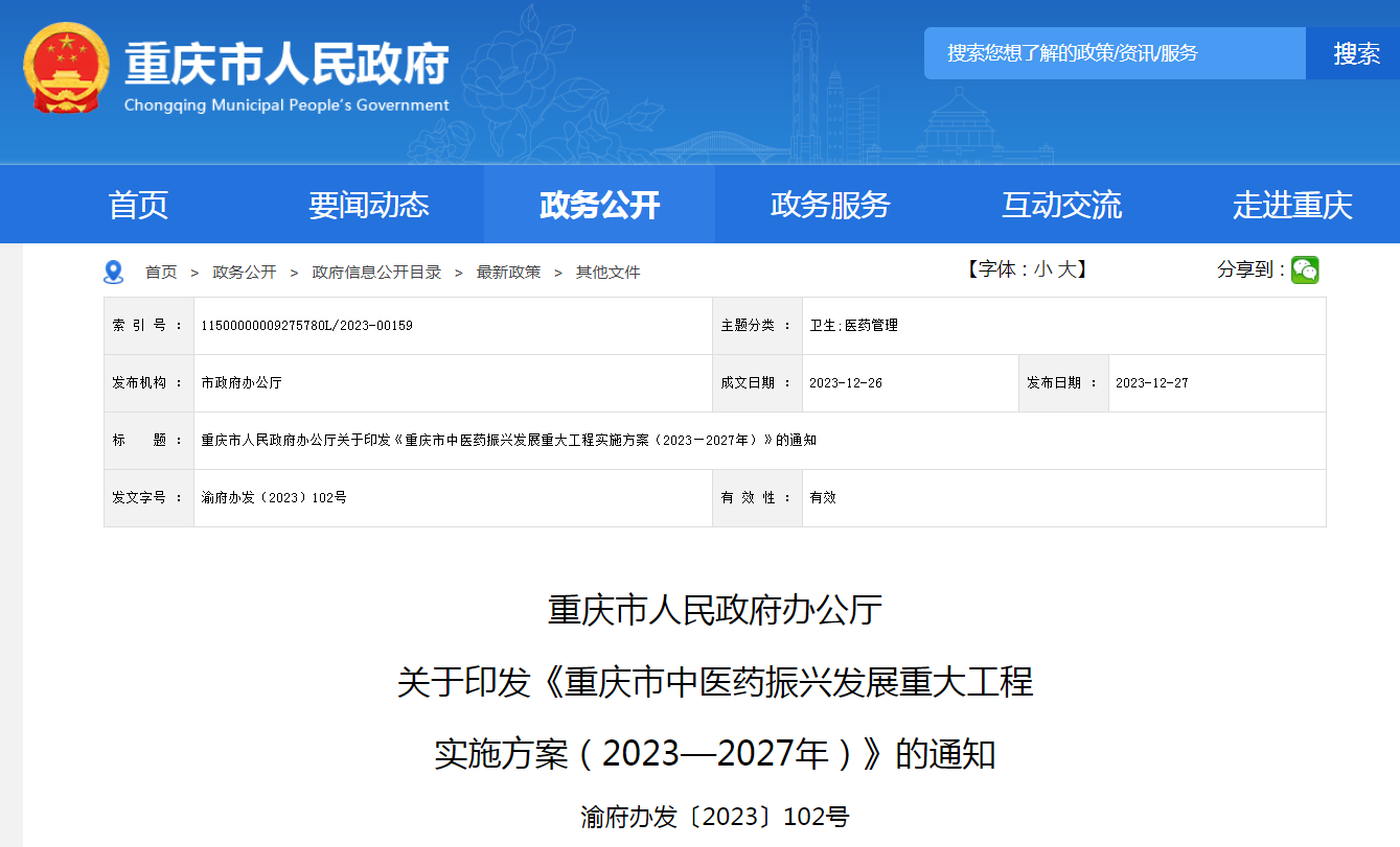 12月26日,重庆市人民政府办公厅印发《重庆市中医药振兴发展重大工程实施方案(2023—2027年)》。方案中,AC米兰中文官方网站及其直属单位、附属医院被多次提及,一起来看看都有哪些重要内容。