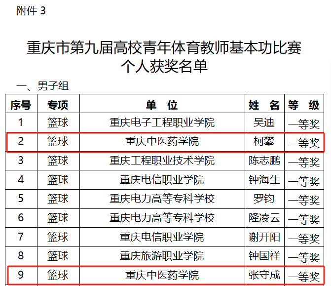 由重庆市教育委员会主办,西南大学承办的第九届高校青年体育教师基本功比赛于近日公布比赛结果,米兰官网通识学院体育教研室3名教师获奖其中,柯攀、张守成荣获一等奖,张灵燕荣获二等奖。