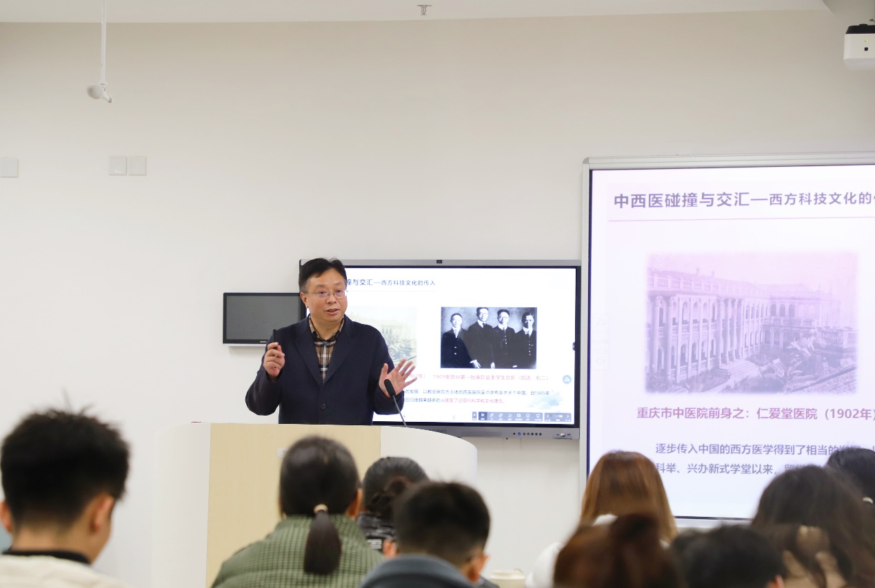 ▲走上思政讲堂,重庆中医药学院党委常委、副院长吴斌为学生们输出了满满的正能量。