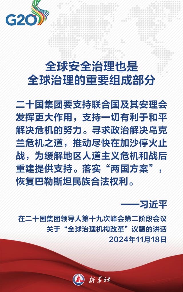 当地时间11月18日下午,国家主席习近平在巴西里约热内卢继续出席二十国集团领导人第十九次峰会。在峰会第二阶段会议围绕“全球治理机构改革”议题讨论时,习近平发表题为《携手构建公正合理的全球治理体系》的重要讲话。