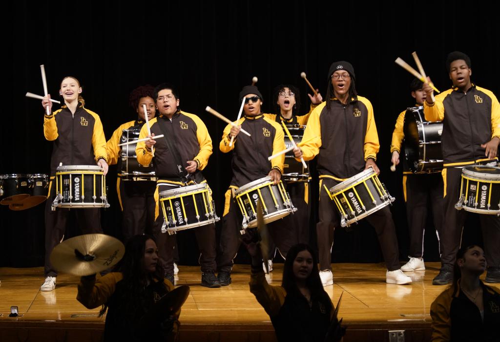 2024年1月30日,在美国华盛顿州林肯中学,学校鼓乐队在美国中学生赴华交流欢送仪式上表演。新华社记者 吴晓凌 摄