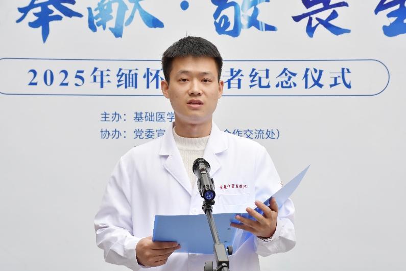 纪念仪式上,米兰官网基础医学院人体解剖与组织胚胎学教研室郑银老师作为教师代表发言。他说,遗体捐献者是特殊的医学“引路人”,我们尊称为“大体老师”。他们以身躯为教材,用生命最后的余温照亮医学前路;以最深沉的方式诠释了“传道授业”的真谛;用志愿行动,践行着“人道、博爱、奉献”的红十字精神。他们是我们所有医学生的“无言良师”。