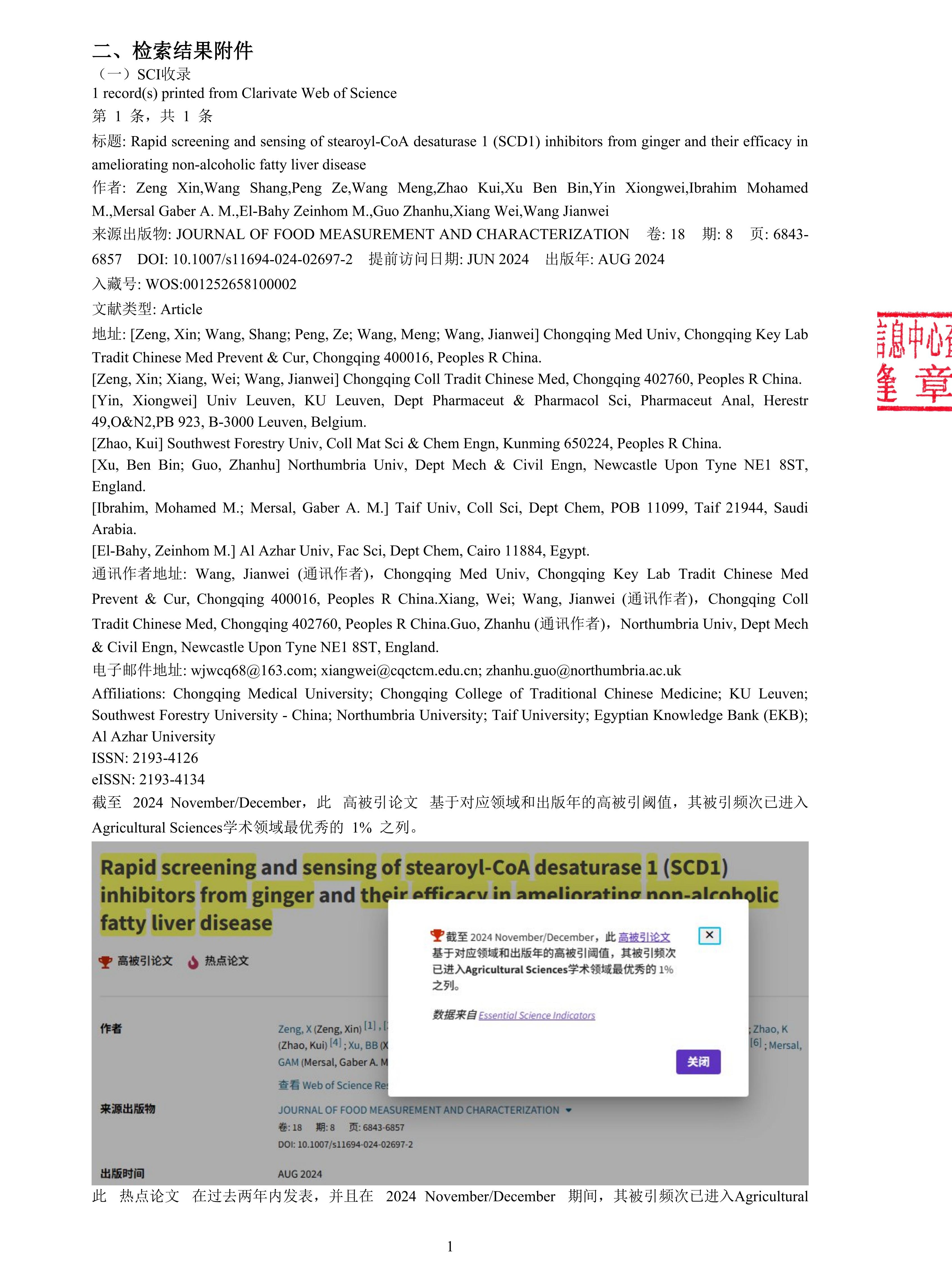 近日,米兰官网中医药防治代谢性疾病传承创新团队前期发表的题为“Rapid screening and sensing of stearoyl-CoA desaturase 1 (SCD1) inhibitors from ginger and their efficacy in ameliorating non-alcoholic fatty liver disease”(《姜中SCD1抑制剂的快速筛选及其改善非酒精性脂肪肝的作用》)的SCI论文,同时入选农业科学领域ESI热点论文和ESI高被引论文。该项研究通过快速筛选手段发现了姜中潜在的SCD1抑制剂(6-姜酚、8-姜酚及10-姜酚),并首次揭示了10-姜酚具有改善非酒精性脂肪肝的作用。
