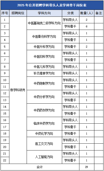 根据学校工作需要,招聘学科带头人及学科骨干人才,包括且不限于中医基础类、中医骨伤科学、中医外科学、中医妇科学、中医儿科学、针灸推拿学、中药炮制学、中药化学、中药药剂学、临床中药学、中药分析学、医工交叉、人工智能等相关学科方向(详见附件)。