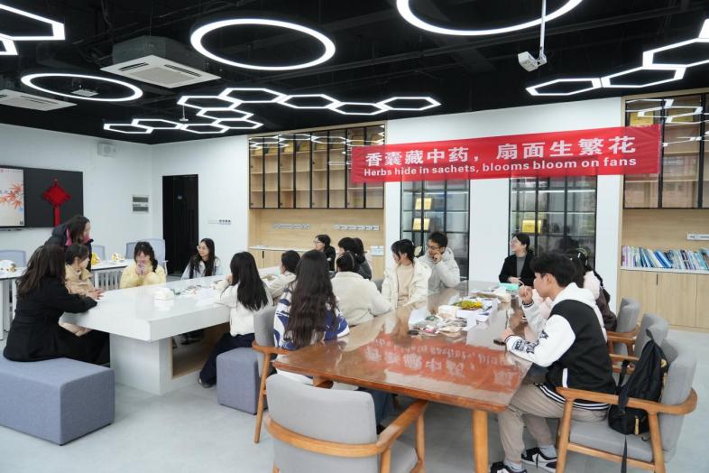 ▲代表团专注投入安神香囊制作,并将中药元素与传统扇面艺术相结合,完成专属文化作品