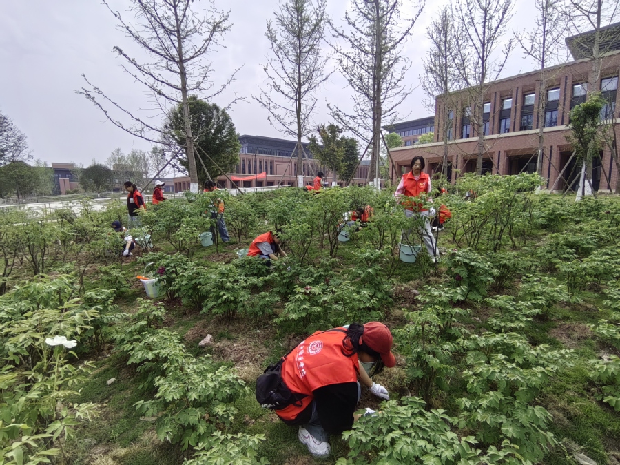 随后,同学们纷纷拿起工具,投入到紧张的劳动中。“除草不能只除草叶,得除到根部才行。”黄红燕老师在一旁示范、指导,提醒同学们要将草根彻底拔除才能避免杂草的再生。阳光下,同学们每人身穿红色马褂,戴着白色手套,提着水桶,握紧镰刀,弯着身子,小心翼翼的保护牡丹和芍药,认认真真清除杂草。