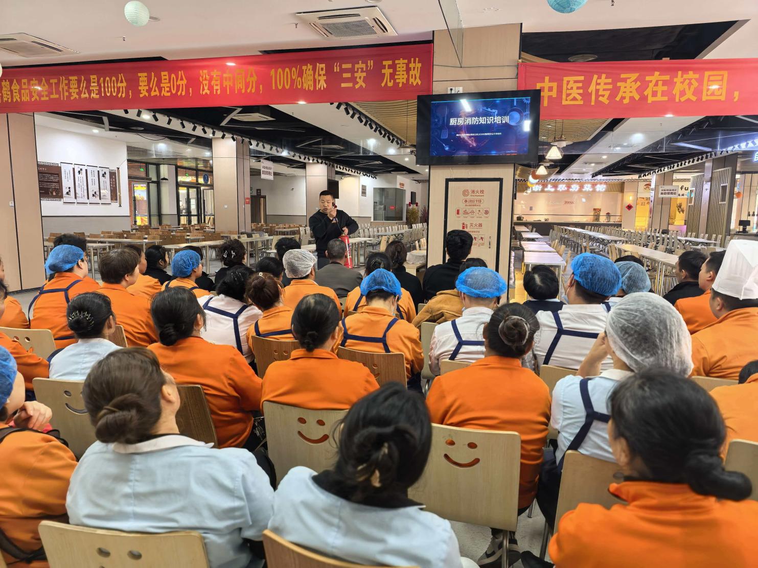培训围绕消防安全“四懂四会”“四个能力”核心要求,重点讲解食堂常见火灾隐患排查、电气线路规范使用、燃气泄漏应急处置、油锅起火正确扑救方法等实用内容,以及灭火器、灭火毯、室内消火栓操作等关键技能,强调火灾报警、初期火灾扑救、人员疏散引导的规范流程,确保参训人员懂原理、会操作、能处置。