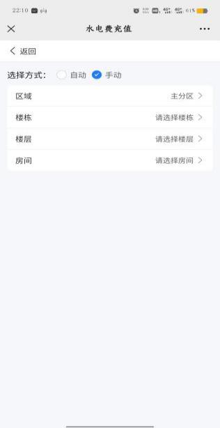 (一)水电缴费是指对宿舍房间的冷水和电充值缴费,系统默认自动给本人所在房间缴费;如果给其他房间充值,请选择手动方式,然后按照提示完成指定房间充值缴费。