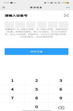 1.首次使用请添加常用房间设备号。设备编号规则:设备代码6位数,前两位为楼号,第三位为单元,后三位为房间号;10号楼包括J1-J411号楼包括J5-J7,以J2-315房间为例,编号: 10231510代表10号楼、2代表2单元、315代表房间号。