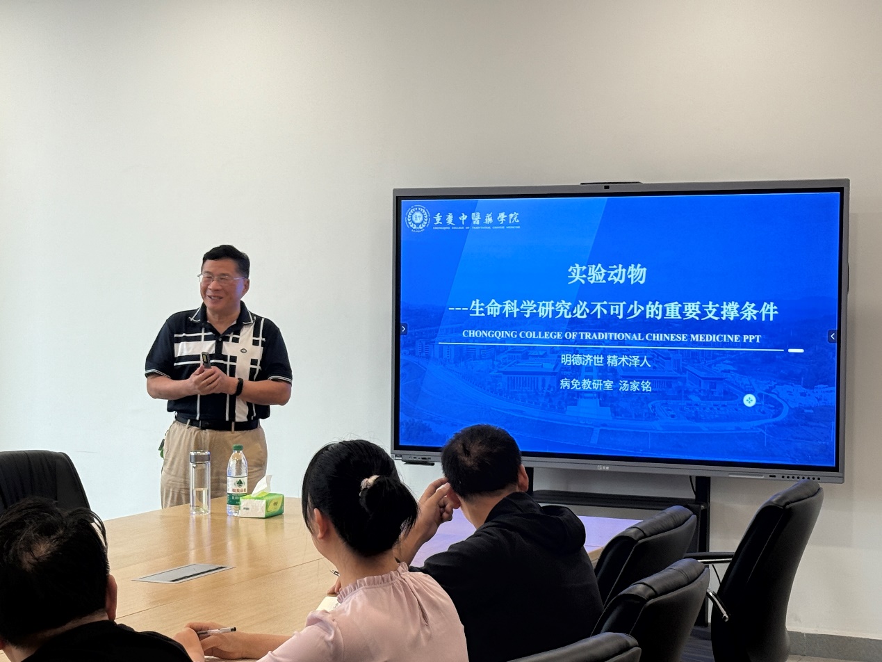 汤家铭研究员在实验动物领域深耕多年,有着深厚的理论造诣和丰富的实践经验。讲座中,他首先系统阐述了实验动物学的基本概念及研究范畴,让大家对实验动物学有了清晰的基础认知。接着,他结合多个具体的实验动物研究案例,强调了实验动物在生命科学研究领域中的作用及地位。此外,汤家铭研究员介绍了我国实验动物学和中医药实验动物的发展情况,鼓励教师们在日常教学和科研工作中充分利用实验动物种质资源共享平台和实验动物信息资源平台。最后,汤家铭研究员强调,实验动物福利伦理与科学研究的平衡是学科发展的基石,呼吁科研人员以“3R原则”(替代、减少、优化)为指导,实现科学价值与人文关怀的统一。