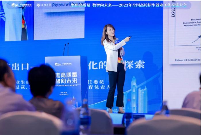 针对教育数字化阿里巴巴集团副总裁、钉钉副总裁、钉钉数字教育负责人邢悦作了《优化生源入口,拓宽人才出口——教育数字化的AI探索》的主题报告。邢悦表示,在促进高校招生方面,依托钉钉广泛的中学家长及用户群体,学校的品牌、办学理念、师资水平和教学质量信息可有效触达目标群体。