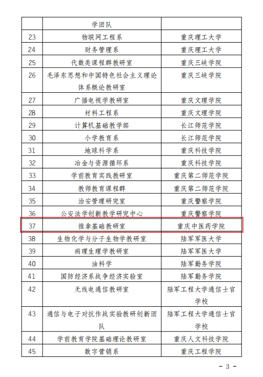 近日,重庆市教育委员会公布了2023年市级优秀基层教学组织典型案例评选结果,米兰官网推拿基础教研室赫然在列。重庆市优秀基层教学组织典型案例评选由重庆市教育委员会主办,面向全市普通本科高校、在渝军队院校。旨在切实发挥基层教学组织在提高教育教学质量中的重要作用,不断强化教学工作,深化教育教学改革,创新组织形式,明确职能定位,健全管理制度,完善运行机制,激发组织活力,充分调动广大教师教育教学的积极性,形成结构合理、功能健全、运行有效的基层教学组织体系。