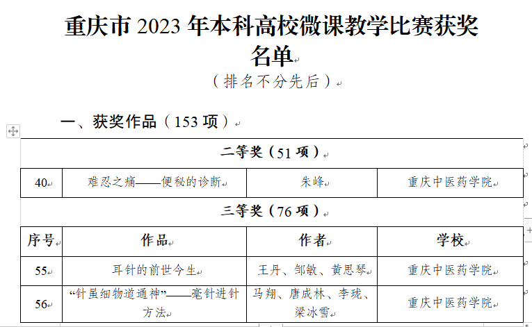 近日,重庆市教育委员会公布了《重庆市教育委员会关于公布重庆市2023年本科高校微课教学比赛获奖名单的通知》(渝教高函〔2023〕75号),米兰官网参赛作品《忍之痛——便秘的诊断难》荣获微课教学比赛二等奖,《耳针的前世今生》《“针虽细物道通神”——毫针进针方法》2项作品荣获微课教学比赛三等奖。