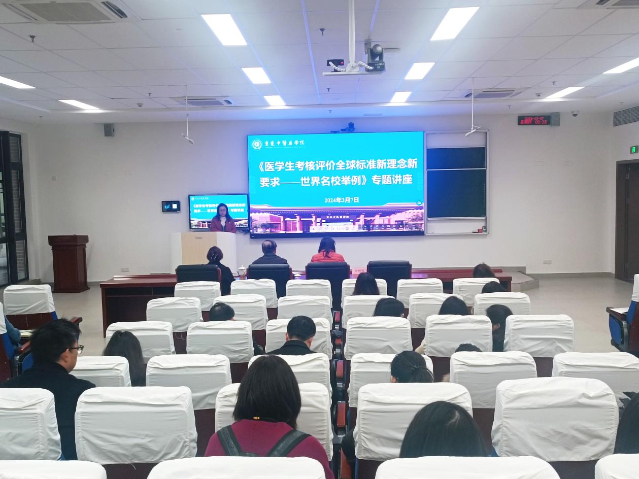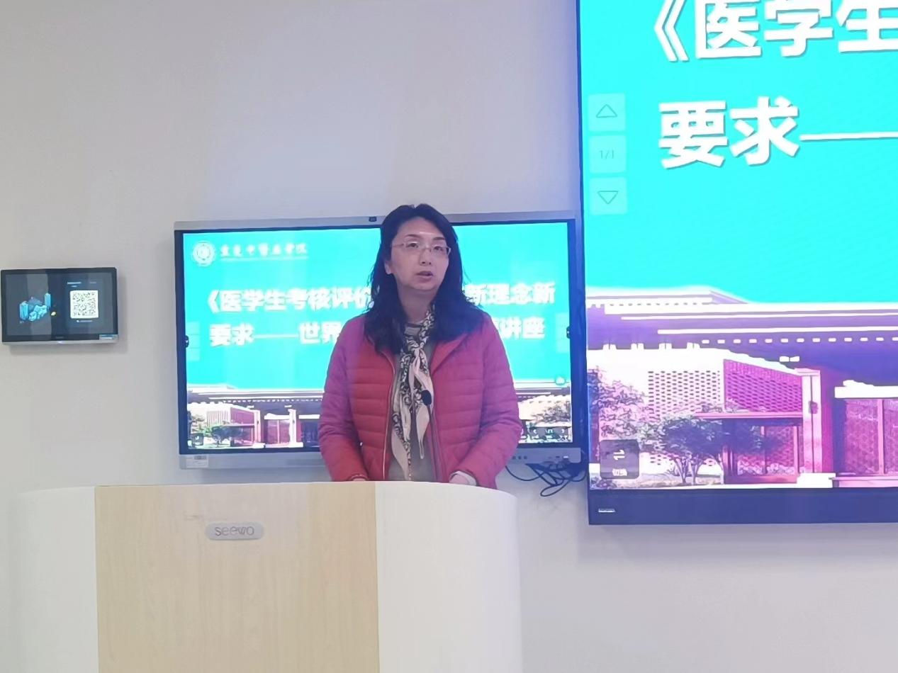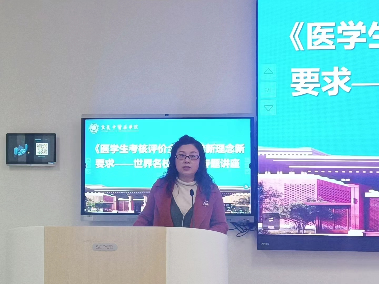 讲座开始前,学院党委常委、副院长唐丽灵对本次讲座作致辞,向前来指导的孙教授表示热烈欢迎,她强调当前我国医学教育蓬勃发展,对中医药人才培养提出了新任务、新要求,医学生考核评价是医学教育中的重要环节,全球化的背景下,医学生考核评价也需要与时俱进,适应国际化趋势和新医科发展的需求。要坚持“以德为先、能力为重、全面发展,坚持面向人人、因材施教、知行合一”的人才培养基本原则,推进科学有效、规范公正的考核评价体系,注重学生的综合素质和能力培养,推动医学教育评价改革的创新与发展。