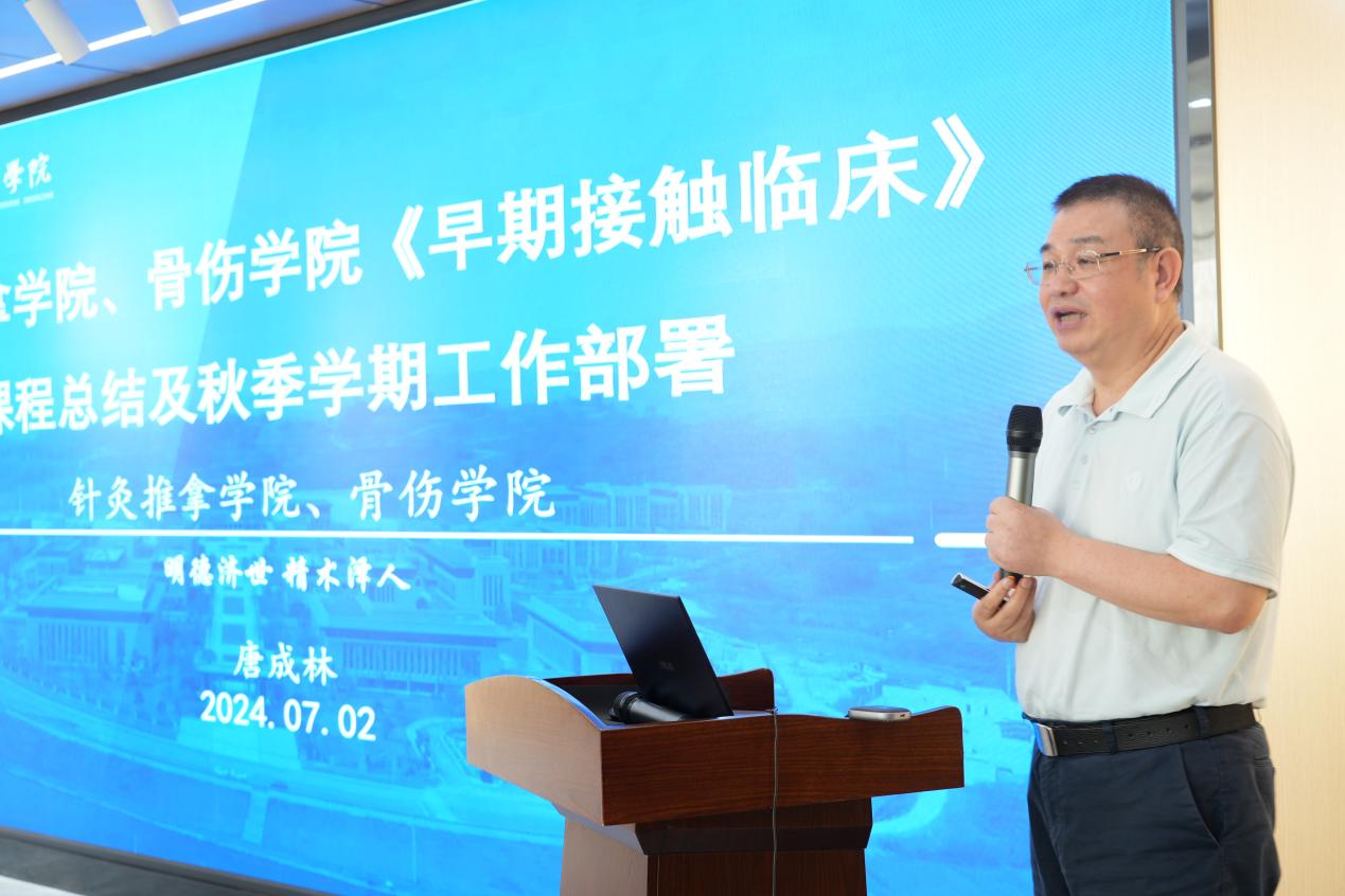会上,开展早临床课程的教学单位先后进行了“早临床”课程总结交流和教学心得分享。其中,针灸推拿、骨伤学院院长唐成林强调了“早临床”教学中理论与实践相结合的重要性,并针对教学中如何培养学生的中医思维和临床能力提出了宝贵建议。随后,与会代表们就“早临床”的实施情况、教学环节和教学内容、学科建设等方面进行了深入的交流与研讨。