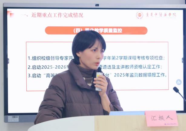 会上,教务处副处长李娟就近期教学运行、课程与专业建设、教学质量监控等方面的近期进展与下一步计划作了汇报。校教学督导组组长黄英如通报了上学期试卷整改落实情况及本学期试卷抽查结果,针对抽查中发现的问题提出针对性改进建议,同时强调了规范考核流程、筑牢考核质量防线的重要性与紧迫性。