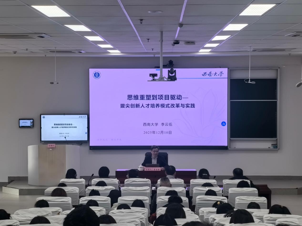 李云伍教授以《从思维重塑到项目驱动——拔尖创新人才培养模式改革与实践》为题,系统阐述了高等教育面临的时代挑战与未来人才培养的需求变化,并结合西南大学“学行科创实验班”的实践探索,从理念更新、课程体系重构、项目设计实施到多元评价改革等方面,全面分享了项目制教学的完整推进路径与宝贵实践经验,通过具体案例生动展现了项目制教学在拔尖创新人才培养中的显著成效。