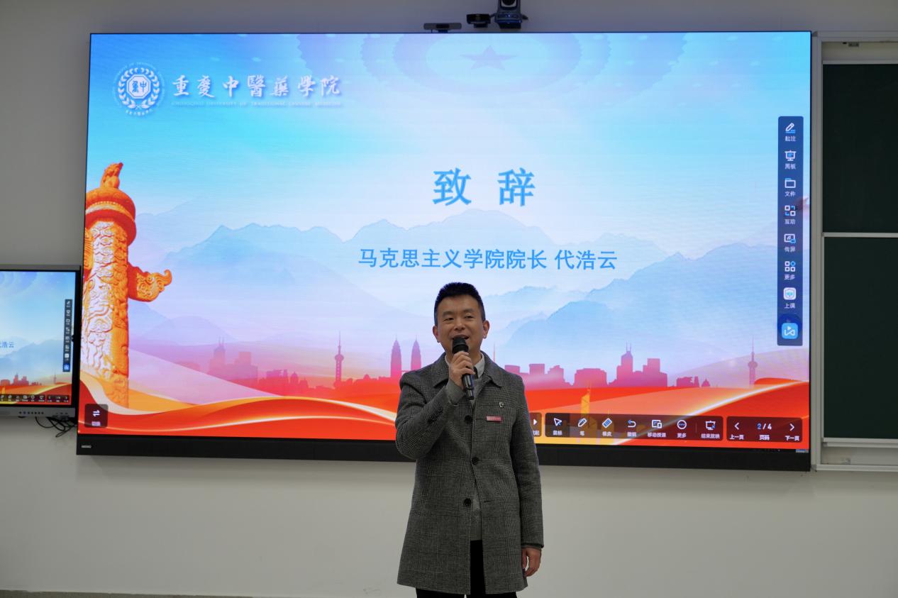 马克思主义学院院长代浩云在致辞中指出,开展思政课实践教学成果展示评比是践行“习近平新时代中国特色社会主义文化思想”、树立学子中医药文化自信、推动思政课守正创新的具体举措,希望同学们通过实践教学成果展示,能够更好的将理论与实践相结合,成长为担当民族复兴大任的时代新人。