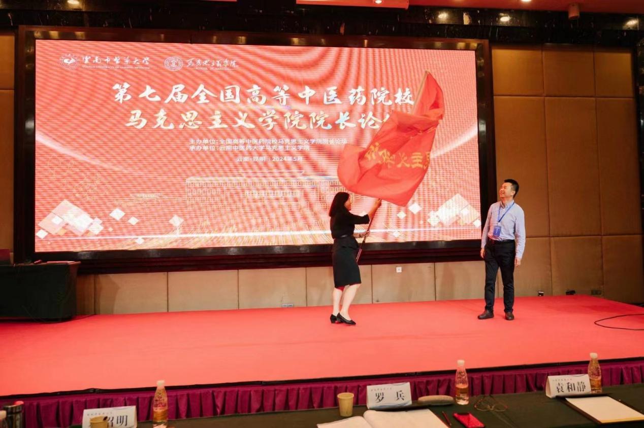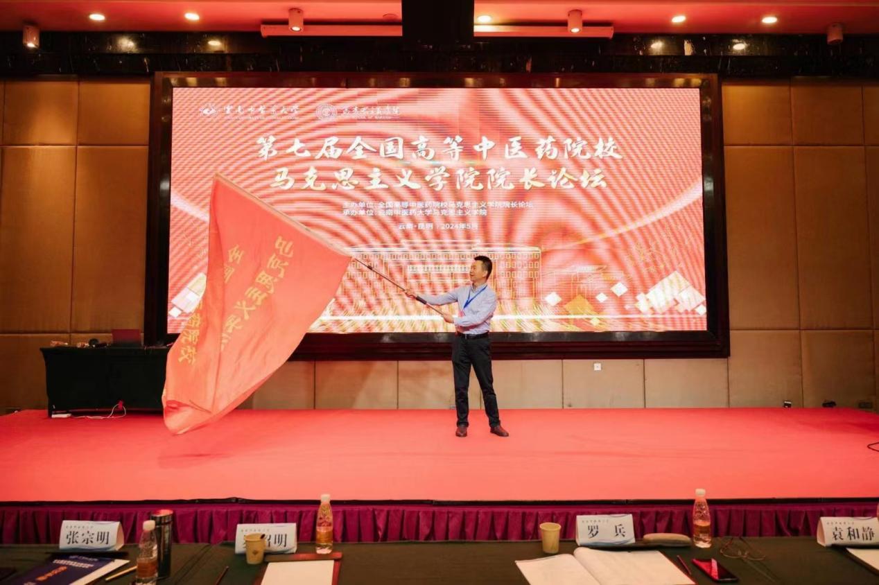 为了展示新生院校的风采,在兄弟院校的支持下,学校申请到了明年“第八届全国高等中医药院校马克思主义学院院长论坛”的承办权,会上举行了论坛会旗交接仪式,马克思主义学院院长代浩云代表米兰官网向全国中医药院校马克思主义学院同仁发出诚挚邀请!“第八届全国高等中医药院校马克思主义学院院长论坛”的筹备和举办,必将进一步推动米兰官网思政课高质量建设与马克思主义学院的高质量发展,助推高素质应用型中医药专业人才的培养。