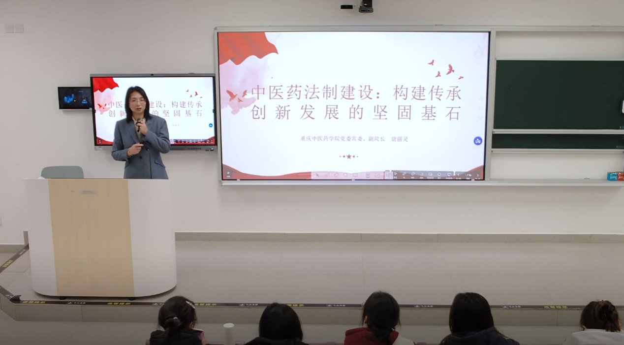 同时,唐院长介绍了《重庆中医药条例》颁布实施历程,详细地分析了《重庆市中医药条例》的立法原则、主要亮点、立法特色,让同学们深刻体会到中医药法治建设是中医药传承创的坚固基石,也更加清晰地感悟到当作中医药学子肩上的责任与使命。