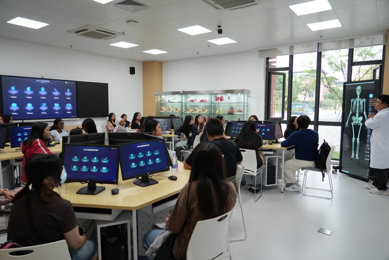 ▲代表团参观学院数字化解剖实验室、中医药文化馆、中药资源及产品展示中心及专项技能实训室,体验中医养生功法——八段锦。