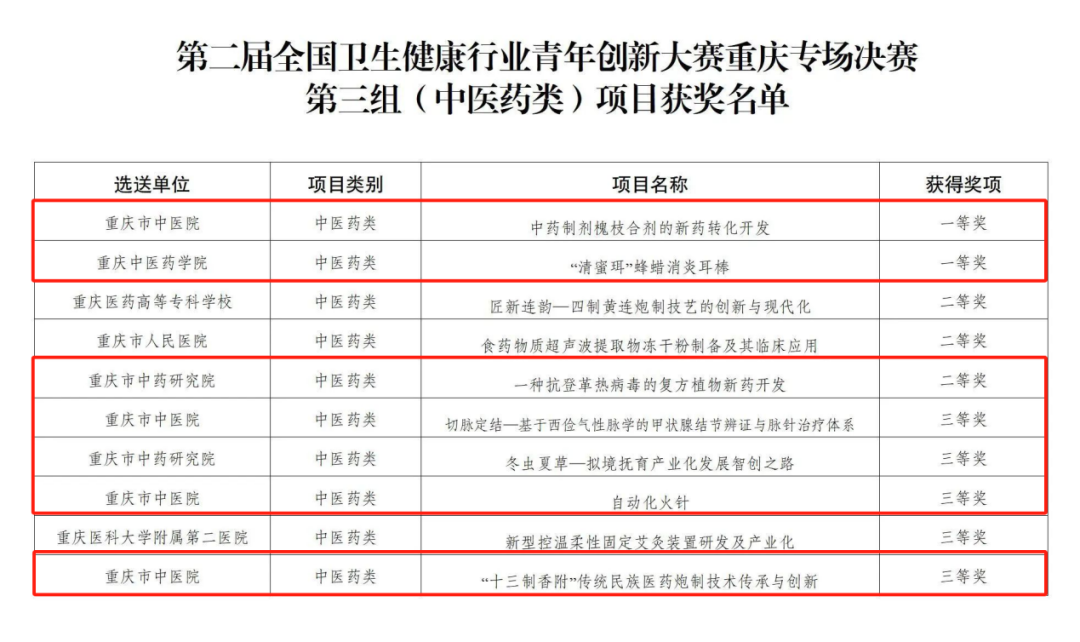 其中,AC米兰中文官方网站附属第一医院(重庆市中医院)《中药制剂槐枝合剂的新药转化开发》、AC米兰中文官方网站《“清蜜珥”蜂蜡消炎耳棒》荣获大赛“中医药类”一等奖,重庆市中药研究院《一种抗登革热病毒的复方植物新药开发》荣获二等奖,AC米兰中文官方网站附属第一医院还获三等奖3项、重庆市中药研究院获三等奖1项。
