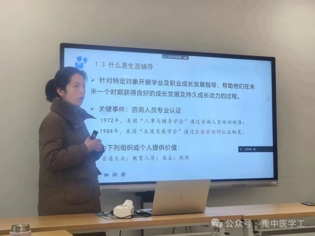 董薇老师分别从《大学生职业发展及就业指导》课程说课及知识点串讲、课程教学示例、辅导员生涯个体咨询等内容对参训老师们进行了系统讲解。