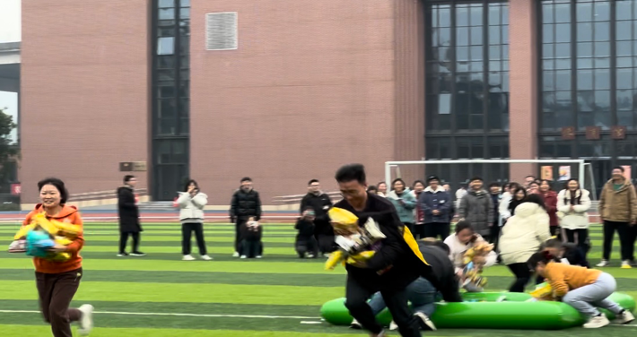 在各个项目中,满园桃李谢春风——老师抢零食大战最为引人注目。比赛限时一分钟,每个班级邀请一名代表老师参加。每个班级的代表老师为同学们奋力抢夺零食,欢声笑语弥漫整个赛场。同学们也为老师的拼搏表现欢呼喝彩,展现了浓厚的师生情谊。