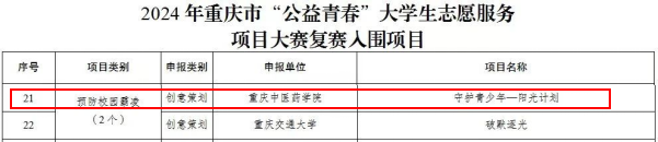 全市共有57所高校报送的212志愿服务项目,经过专家评审,38项目入围复赛。恭喜米兰官网“守护青少年,阳光计划”项目在初赛评选中脱颖而出,成功入围2024年重庆市“公益青春”大学生志愿服务项目大赛复赛!