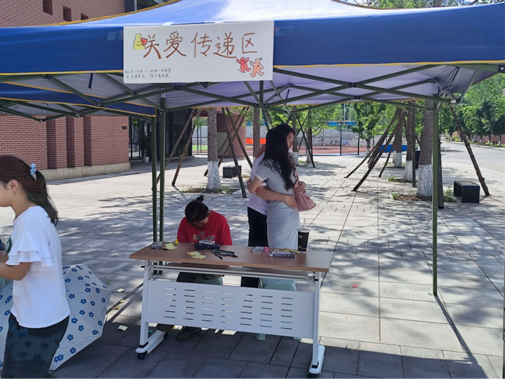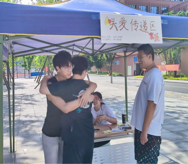 紧接着,目光转向关爱传递区,同学们在现场寻找志同道合的小伙伴,相互拥抱,并在便签上写下一段鼓励对方的话,贴到对方身上。这一环节不仅增进了同学们之间的友谊与信任,更让他们感受到了来自同伴的温暖与支持,收获了宝贵的情绪价值,得到了难以言表的快乐与满足。