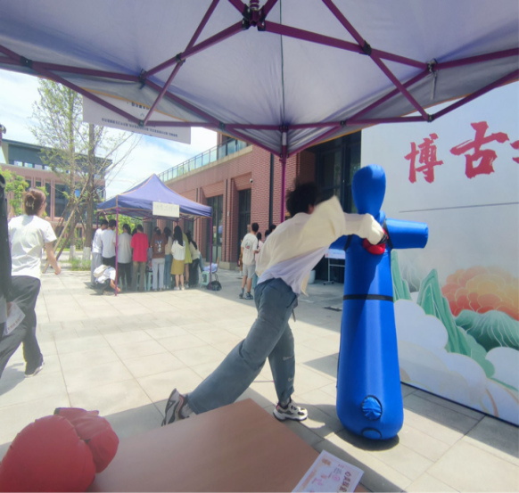 首先,在压力释放站,同学们有序排队,戴上拳击手套捶打假人和沙包,每一次的“重拳出击”都仿佛将积压在心中的压力与困扰一扫而空。