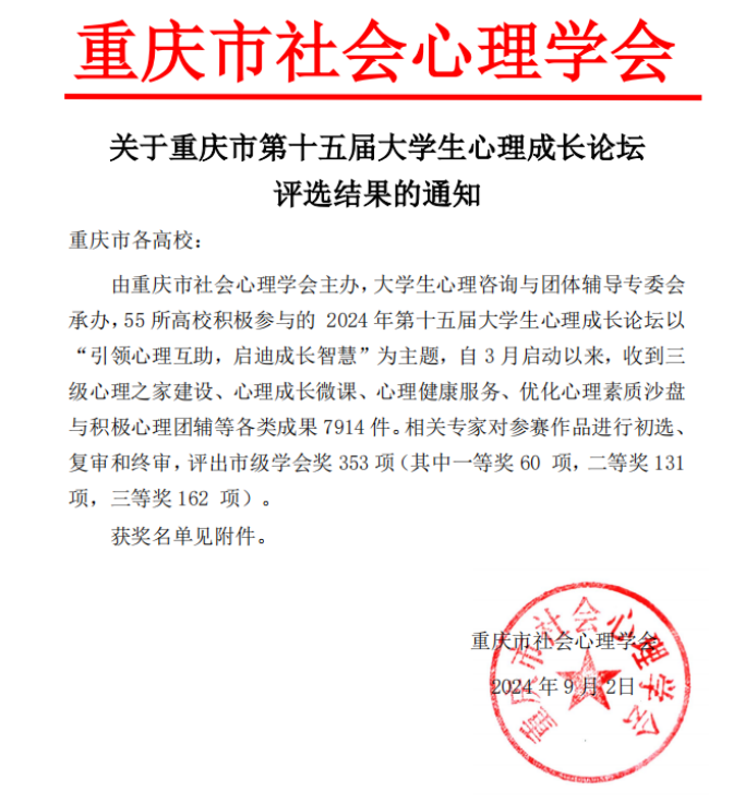 近日,重庆市社会心理学会发布《关于重庆市第十五届大学生心理成长论坛评选结果的通知》,米兰官网推送8项成果均获奖,其中一等奖1项,二等奖3项,三等奖4项。