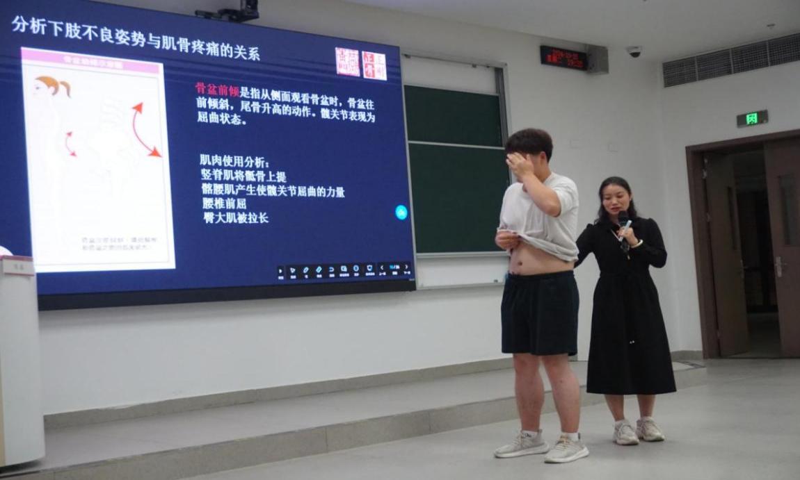 跟随着陈教授的口令,同学们纷纷起身一起练习起来,此功法通过精准的动作与呼吸节奏的配合,实现了身心的和谐共鸣,全面锻炼了肩颈、腰背及四肢等多个关键部位,不仅有效缓解了学生们的肌骨疼痛,在一定程度上减轻了同学们的心理压力与焦虑情绪。