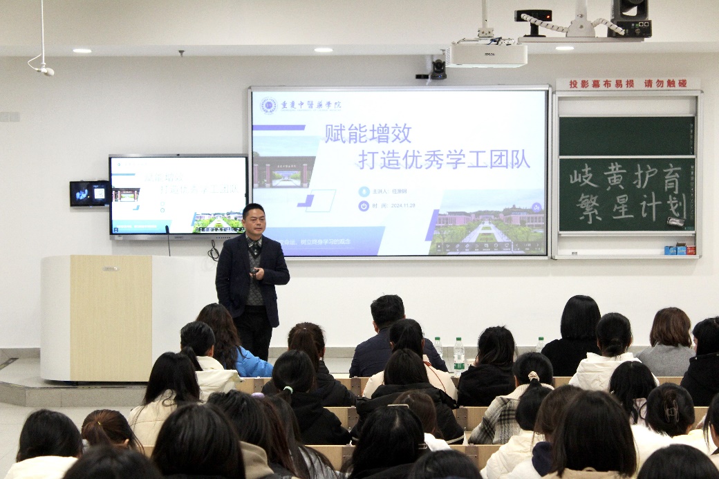 任源钢部长以“赋能增效,打造优秀学工团队”为主题展开培训。他首先对学生干部定位及其基本素质展开剖析,明确了学生干部的本质首先是学生,其次是干部,最后是学生干部。学生干部要有良好的观察能力、信息机制、沟通能力、工作能力。同时阐释了基于学生干部素质的团队建设理论,并系统介绍了学生干部团队建设理论的方法论,及系统论的思维模式、组织模式、团队素质构建模式。对在场各位学生骨干给予方法与定位的引导。最后,任部长还总结了团队建设理论的实践成果——大学生自我教育机制,以及大学生自我教育机制的内在结构与内在作用。并分享对学生工作的观察与感悟,启发学生干部们要树立终身学习的观念。
