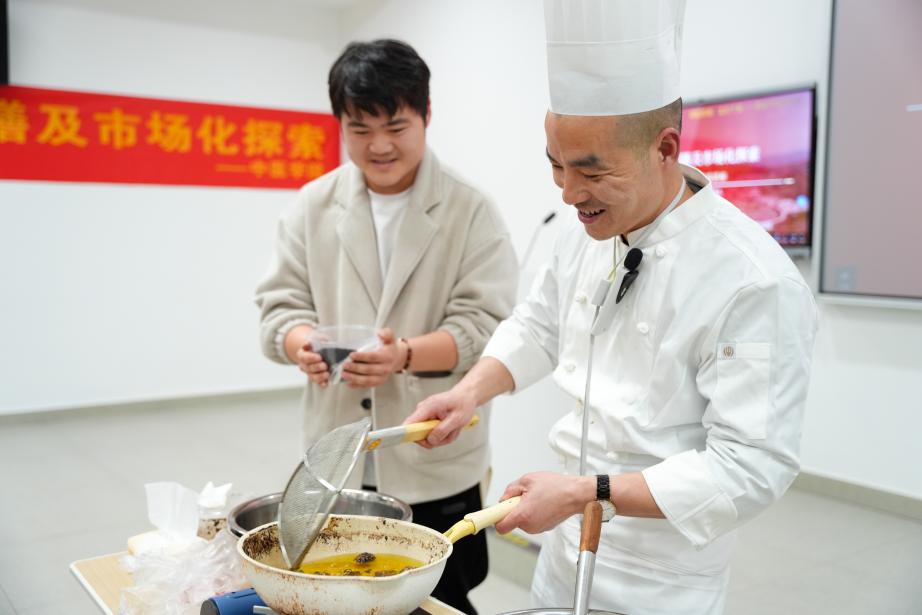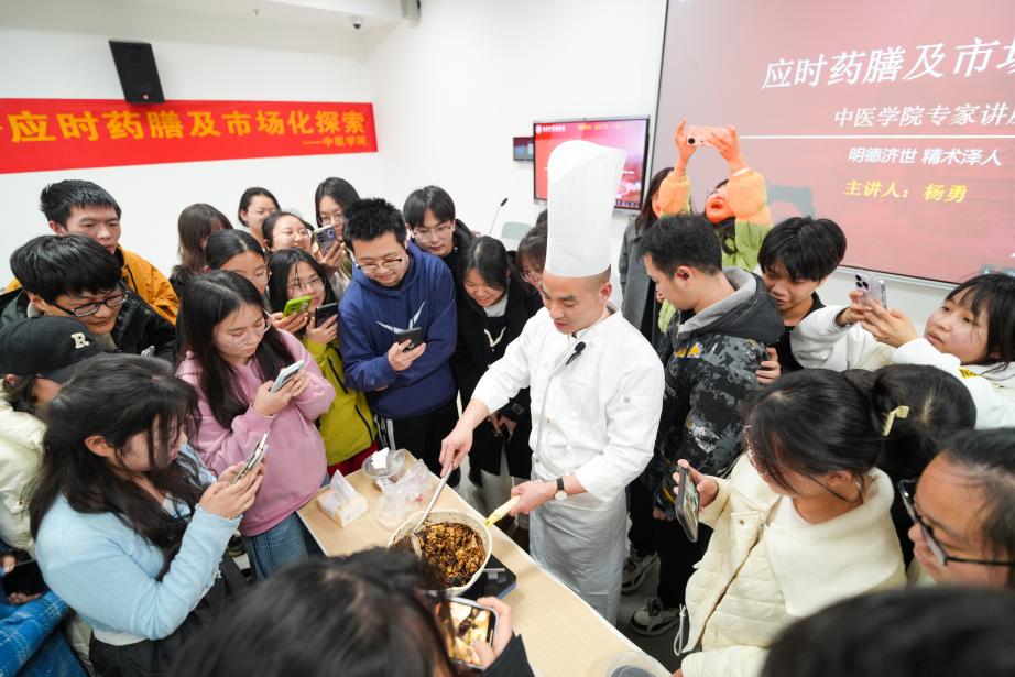 讲座尾声,杨勇所长播放了关于“大有油茶”的视频,展示了药膳在实际生活中的应用。同时邀请了全国药膳大师赵亮老师现场制作药膳固元五珍核桃仁,让学生们切身体验了药膳的魅力。