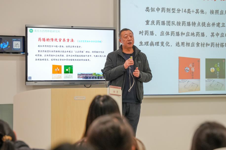 随后,杨勇所长详细讲解了药膳的分类及其在中医药文化中的地位。他提到,药膳可以分为治疗型药膳和康养型药膳,而重庆药膳团队提出的“三应药膳”理论则将药膳分为应时药膳、应体药膳和应地药膳。应时药膳是根据不同季节、气候以及人体生理病理变化,选用相应食材和药材搭配而成的养生膳食。他强调,药膳的应用应遵循“应时应体应地”的原则,即选择当地当季的食材,以达到最佳的养生效果。