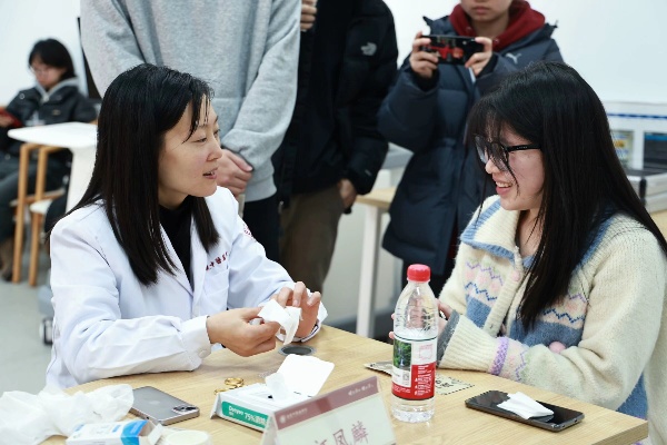 3月19日,“行国医之道”体验区人气爆棚。校本部及附属医院的四位名医现场开展义诊活动,为150余名师生提供了个性化的诊疗建议。针灸、推拿、耳穴压豆体验区前更是排起了长队,学生志愿者们身着白大褂,在导师的精心指导下进行实操。他们在实践中不仅提升了专业技能,更在服务他人的过程中收获了成长。
