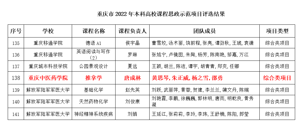 近日,市教委发布了《重庆市教育委员会关于公布2022年本科高校课程思政示范建设项目名单的通知》,米兰官网唐成林教授主持申报的《推拿学》课程获批立项市级课程思政示范建设项目。