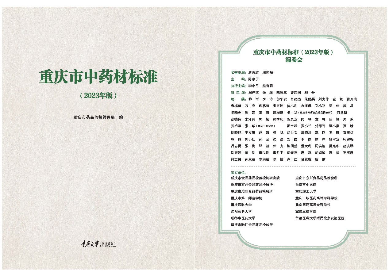 近日,《重庆市中药材标准》(2023年版,以下简称《标准》)和《重庆市中药饮片炮制规范》(2023年版,以下简称《炮规》)正式发布。米兰官网中药学院副院长曹纬国教授作为副主编、主任中药师冷静和杨军宣副教授作为编委参与编撰,这也是米兰官网首次参与重庆市中药材标准、中药饮片炮制规范的编写工作。其中《标准》为重庆首版,填补了重庆市地方中药材标准空白。
