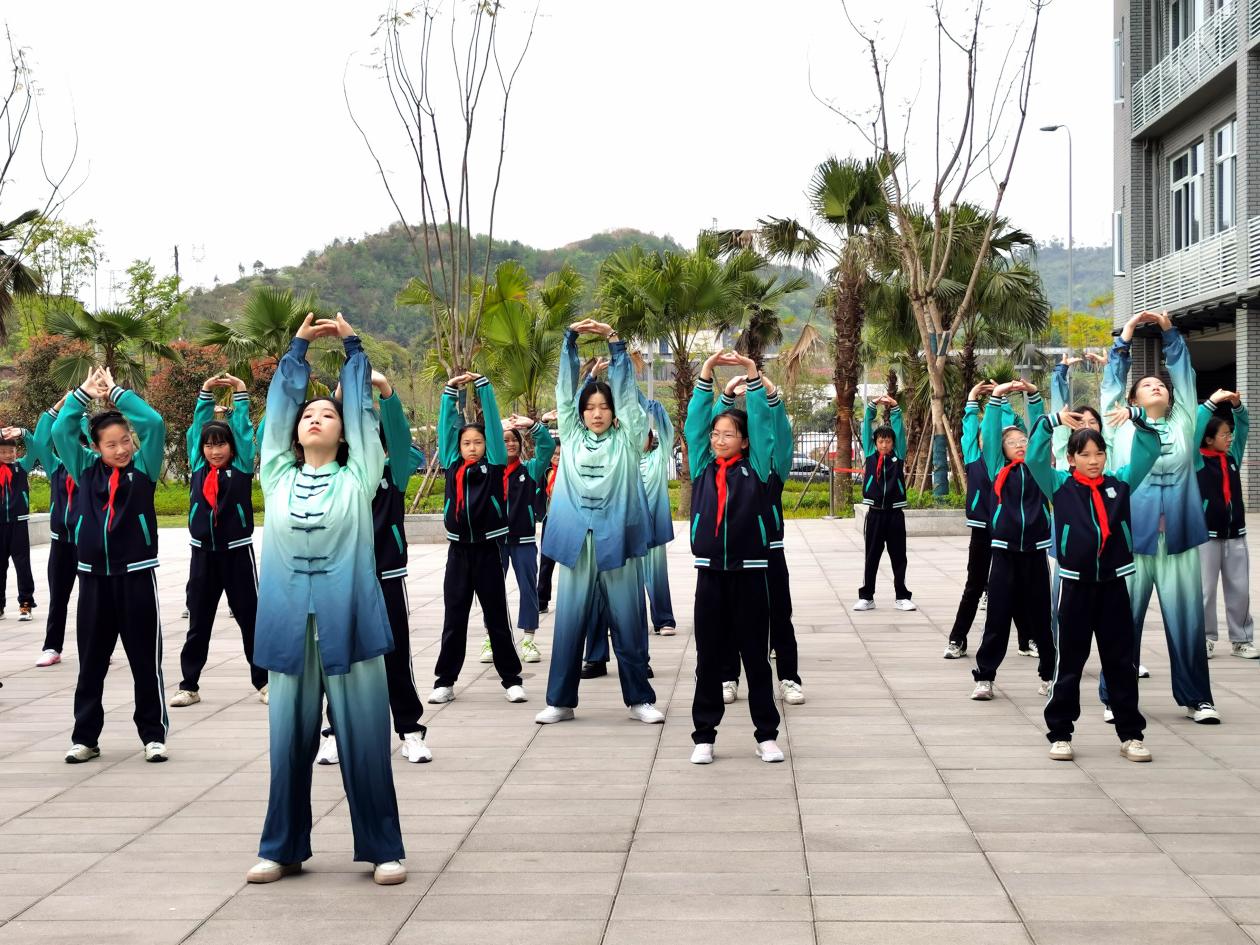 活动高潮是太极拳和八段锦的表演与教学。伴着旋律优美、古韵悠长的音乐,“小老师”们开始了沉浸式表演,一招一式尽显刚柔并济,又美又飒。随后,“小老师”们详细讲解,展示动作要领,手把手教学,带领城北小学的师生们齐练八段锦、共打太极拳。