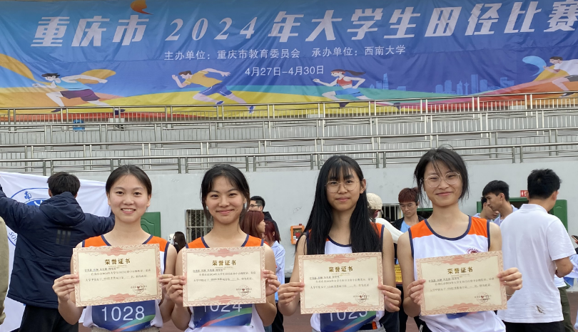 4月27日至30日,重庆市2024年大学生田径运动会在西南大学成功举办。米兰官网运动健儿谷美影、何琳、朱宪霜、周琴琴以4分37秒11的优异成绩成功摘得甲组女子“4×400米”接力赛金牌。