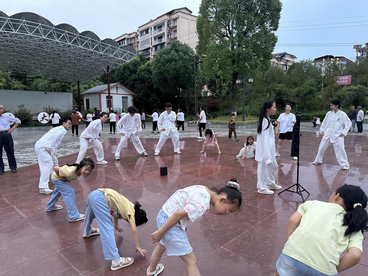 黄昏时分,夕阳西下,在大顺镇广场上,实践队成员们带领村民们一起体验拥有800多年历史的传统健身功法——八段锦。实践队成员们身着太极服,动作轻柔舒展,举手投足间尽展八段锦的魅力;伴随着优美的音乐口诀,队员们将每一个动作步法、手形进行分解,现场教学,让村民们逐步掌握动作要领。这场“八段锦”进广场活动,在给当地群众带去健康之余,还促进他们对中华传统瑰宝有了进一步的认识、了解,让中华传统养生文化得到更好地传承。