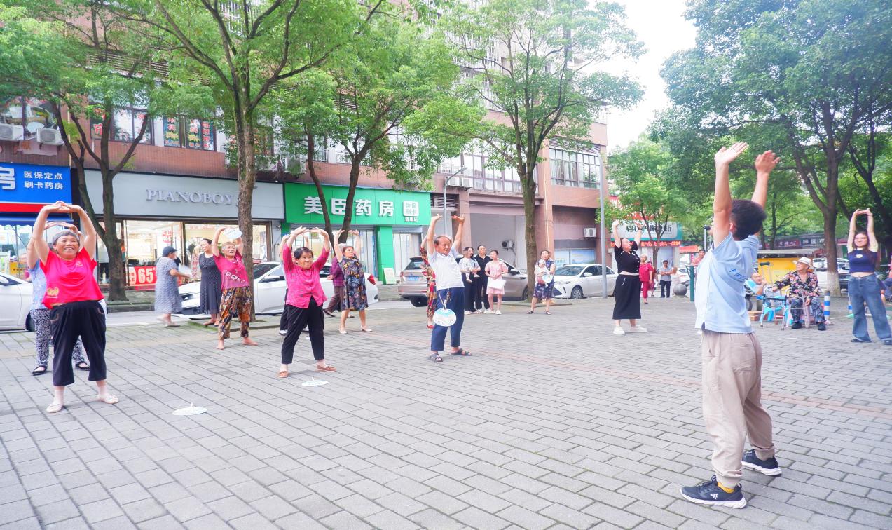 除了传统的中医知识宣讲外,实践团还特别开展了八段锦和健身操的教学。八段锦作为一种古老的健身方式,结合了呼吸、动作和意念,对于增强体质、预防疾病具有显著效果。在队员的演示下,村民们跟随音乐节奏,一起练习八段锦和健身操,感受着中医养生的独特魅力。