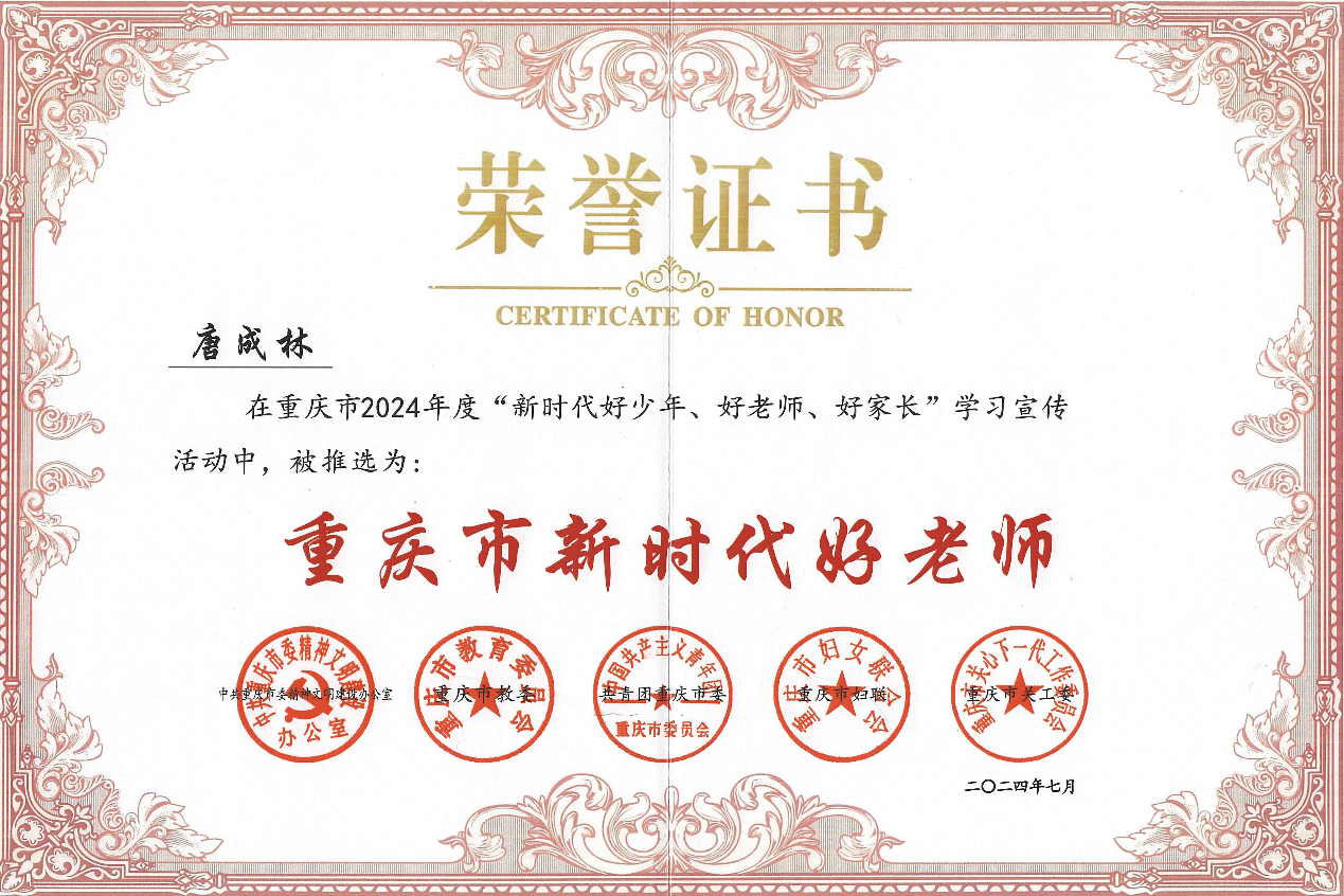 近日,由中共重庆市委精神文明建设办公室、重庆市教委、共青团重庆市委、重庆市妇联、重庆市关工委联合开展的重庆市2024年度“新时代好少年、好老师、好家长”学习宣传活动评选结果公布,米兰官网针灸推拿学院院长唐成林被评为“重庆市新时代好老师”。