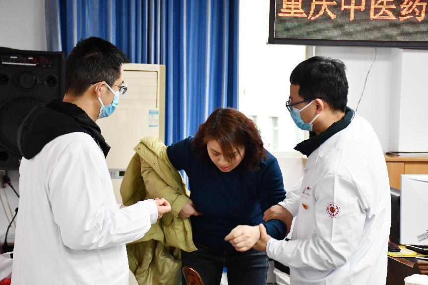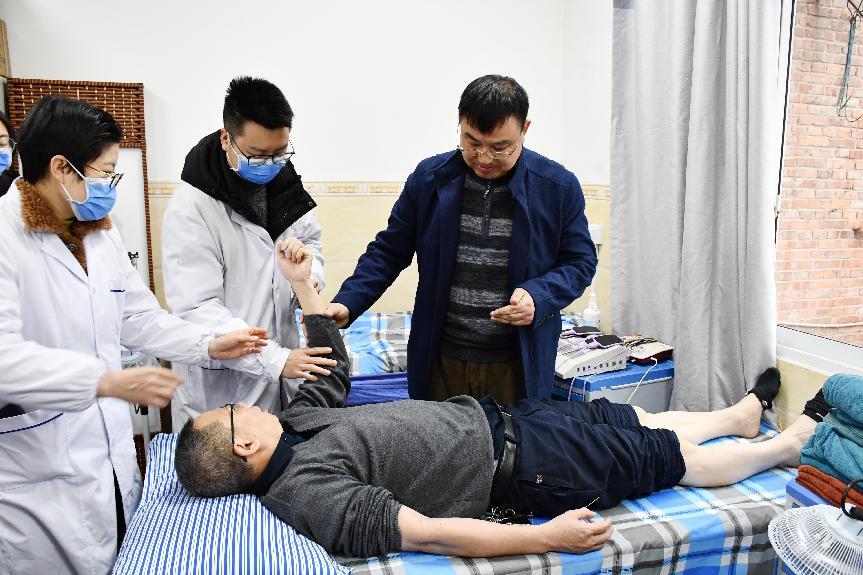 ▲针灸推拿学院院长唐成林在璧山区大路街道社区卫生服务中心中医馆指导社区医生施针治疗